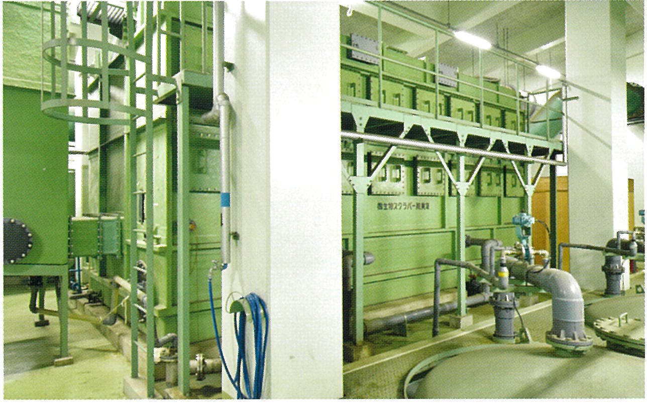 本施設の特長でもある脱臭塔です。薬品の使用を最小限におさえ、臭気を微生物の作用により脱臭するクリーンな装置です。 |