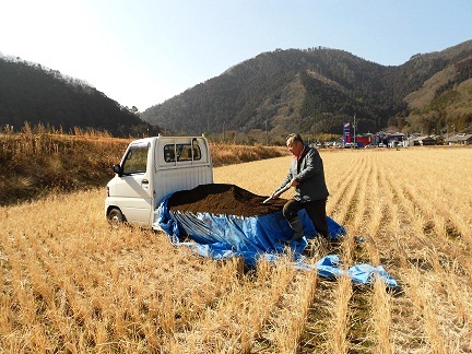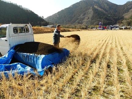 田んぼが乾いていればそのまま持ち込んで肥料散布が可能です。
